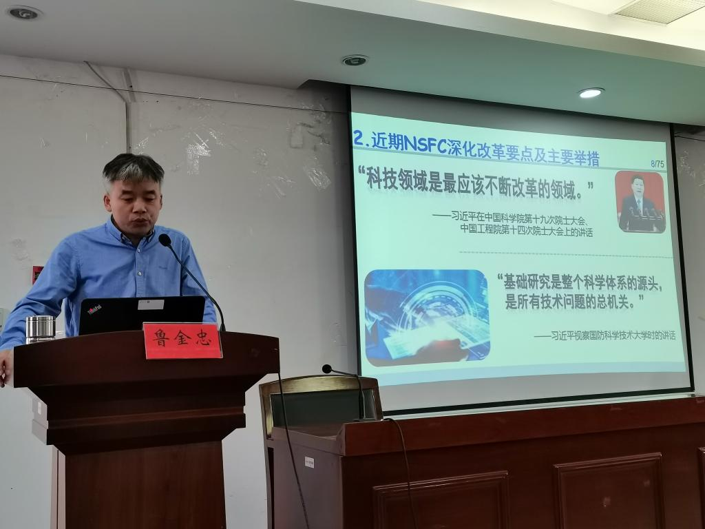 随后,鲁金忠院长详细解读了自然科学基金的申请政策,结合自己成功获批基金的实例生动地阐述了如何进行科学创新、关键科学问题凝练、立项依据、研究基础与可行性撰写以及申请书撰写注意事项等内容,特别强调了“创新是灵魂”、“科学问题是关键”,并诚挚分享了其自身科学研究的心路历程和经验,使参会的老师们受到了很大的鼓舞和启发。报告最后,鲁院长对“十四五期间学院的基金申请工作进行了展望,并对青年教师的基金申请工作提出了更高的要求。
