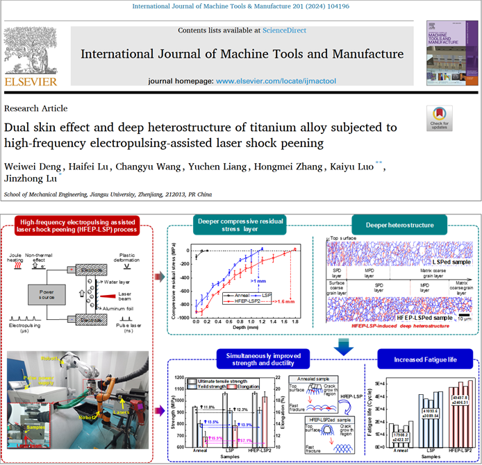 近日,我校1946伟德国际源自英国鲁金忠教授团队在机械制造领域顶刊《International Journal of Machine Tools and Manufacture》(国际机床与制造杂志)上发表了题为“Dual skin effect and deep heterostructure of titanium alloy subjected to high-frequency electropulsing-assisted laser shock peening”的研究论文。该研究成果提出了一种新型高频电脉冲辅助激光冲击深度强化技术(HFEP-LSP),其在Ti6Al4V合金表层诱导双“趋肤效应”,残余压应力层深度从>1000 μm增加到>1600 μm,与LSP相比残余压应力深度提高了60%,塑性变形层深度提高了83.3%;与Ti6Al4V原始试样相比,极限抗拉强度、屈服强度和延伸率分别提高了12.3%、13.9%和57.1%,疲劳寿命增加到49497.8±2406.31次循环,提升了176.4%,实现强韧性的协同提升和疲劳寿命的大幅度增长。1946伟德国际源自英国博士生邓维维为第一作者,鲁金忠教授和罗开玉教授为共同通讯作者。