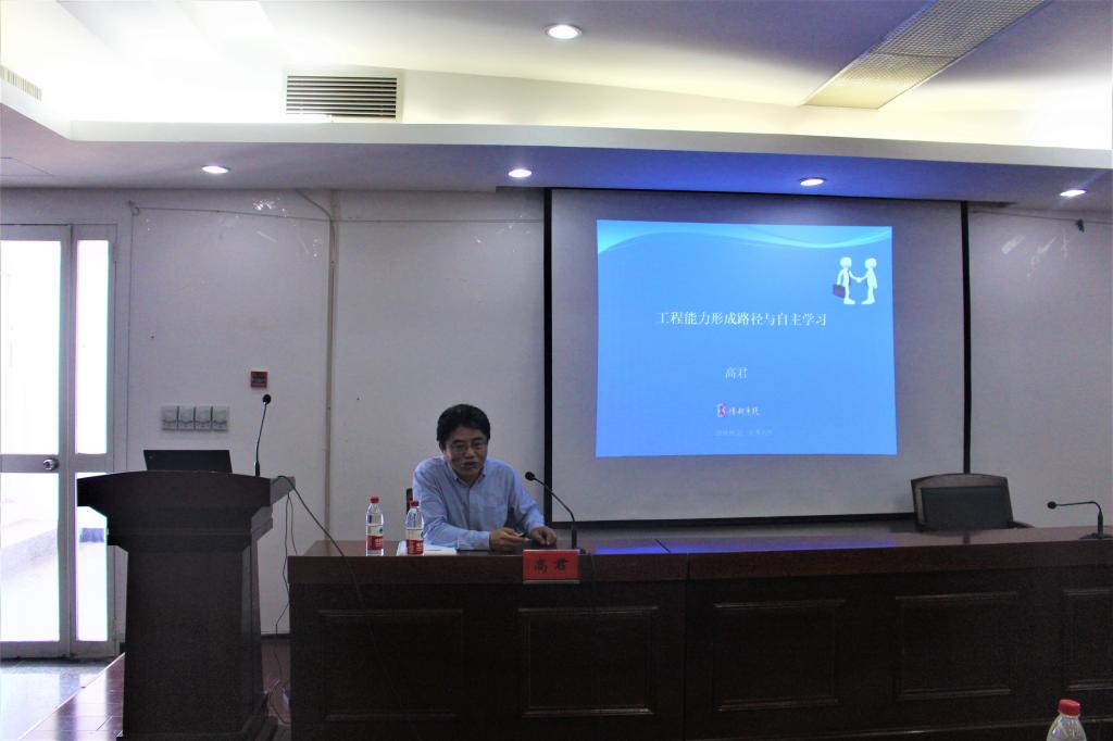 高君董事长介绍了“以学生为中心,以产出为导向”的工程认证理念,通过多年的企业、高校工程认证的工作经历介绍了工程教育回归工程实践体系的工程能力培养方式,并详细介绍了评估任务、评估已有知识和技能、规划方法、应用策略自我监控、反思根据实际需要调整的以项目为依托,驱动学生自主学习的认知策略。高君董事长鼓励在校学生扎实学习本专业知识,积累工程实践能力,为将来工作打下坚实基础。