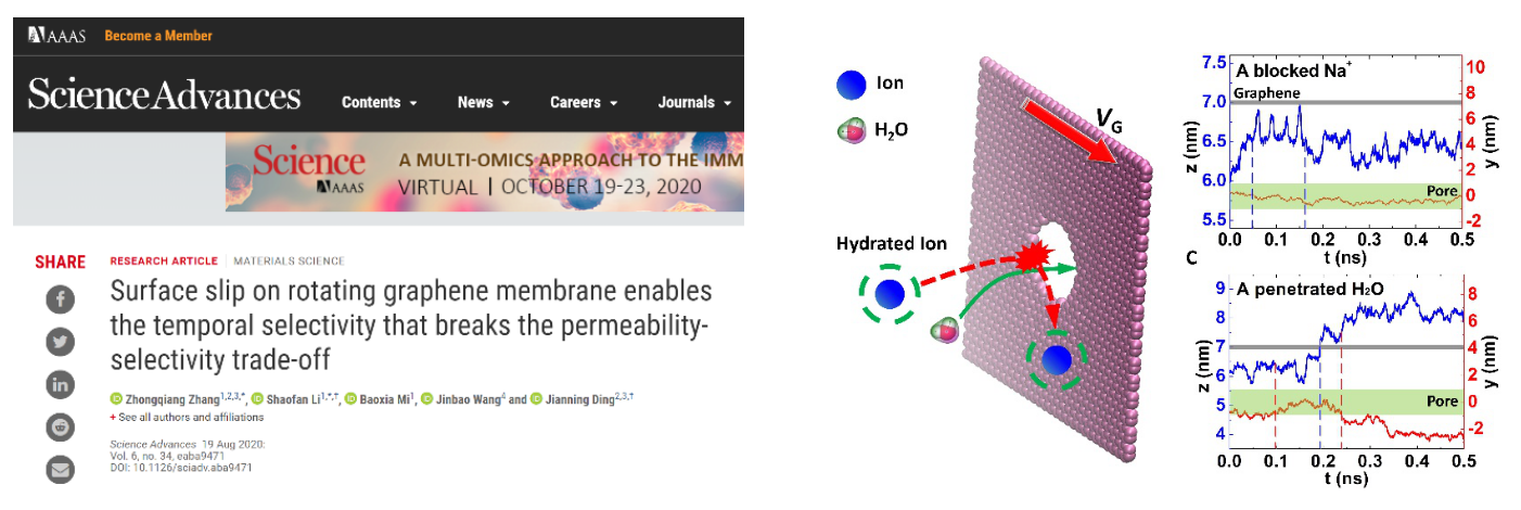 该成果从理论上提出了“时间维度选择性”(或“四维筛选”)概念。简单来说,当水合离子切向滑过微孔的时间小于其法向通过微孔的时间时,离子则被截留在供给端。“四维筛选”巧妙利用了时间维度进行了离子筛选,一定程度上突破了微孔特征尺寸对选择性-渗透性的相互制约。并且,在石墨烯上制备均匀的2 – 4 nm微孔已经有实验成果报道,所提出的旋转多孔石墨烯离心机模型在尺度放大(scaling up)方面具有充分的可行性。在不久的将来,旋转的多孔石墨烯离心机将可能替代传统的多孔反渗透膜,在海水淡化、农业灌溉和水处理等领域发挥巨大作用,进而为解决全球淡水资源危机提供重要途径。