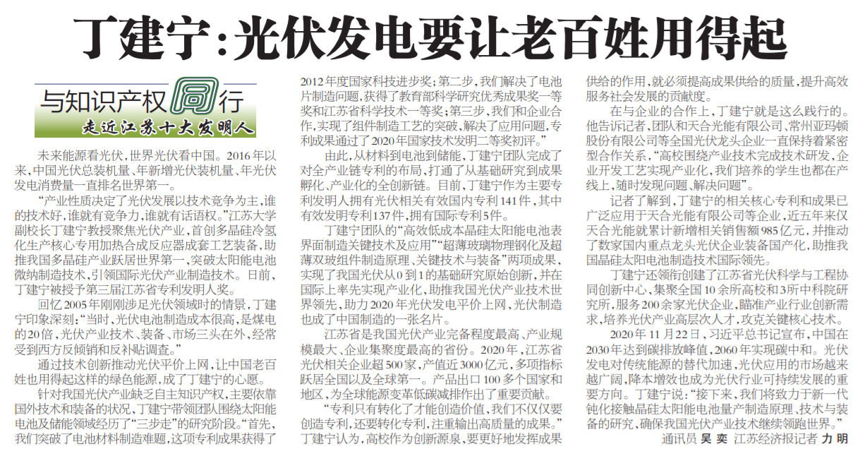 伟德国际victor1946丁建宁教授光伏发电技术在江苏经济报报道