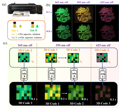 团队通过对碳纳米点的内核掺杂和表面态调控,将其打印到纸上首次实现了碳纳米点的时间响应变色磷光。该材料在特定波长范围(395nm)光激发停止后,磷光颜色在数秒内展示橙色到绿色的动态变化。另外,该材料变色特性展示了独特的波长依赖性,即仅在特定的波长(395nm)激发后具有动态的变色行为,在高于或者低于该波长(例如365nm或者425nm)仅展示单一不变绿色或者红色磷光。基于碳纳米点这些优异特性,首次将其应用到三维彩色编码中,实现了信息的多层次加密、存储与动态显示。该研究提出了一种基于碳纳米点内核掺杂和表面态调控实现碳纳米点时间响应变色磷光新方法,为信息的多层次加密和动态存储应用提供了新工具和新机遇。