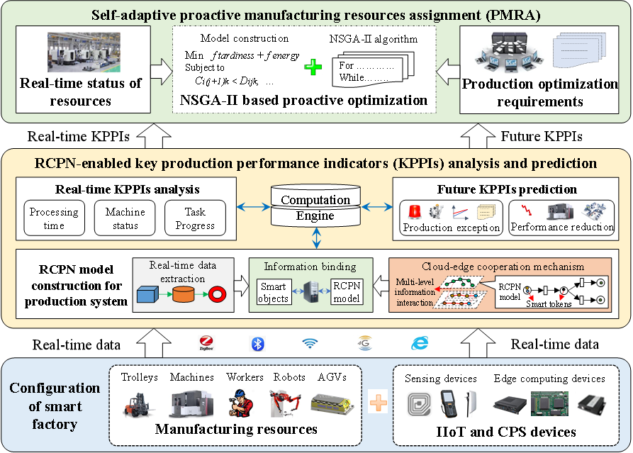 首先,通过配置IIoT与CPS设备,在智能车间内构建边云协同环境:一方面,使得制造资源具有一定的智能决策能力,能够在边缘侧设备端自主制定参数调整等决策方案;另一方面,云端控制服务器能够与边缘设备不断交互共享信息,协同制定生产决策措施。然后,提出了一种基于实时时间着色Petri网(Real-time Coloured Petri Net, RCPN)的关键生产性能指标(Key Production Performance Indicators, KPPIs)的实时分析与动态预测方法,通过设置智能交互元素,将物理空间中实际制造资源与虚拟空间中RCPN模型内部对应要素相绑定,实现虚实动态同步,进而结合Petri网自身的推理能力分析出制造系统KPPIs的实时状态,并动态预测出KPPIs的未来状态信息。最后,构建一种制造资源自适应配置机制,在预测出生产异常后,自下而上地构建异常事件自适应响应模型,并通过多目标遗传算法求解出最优决策方案,为制造系统的资源优化配置提供一种新的决策模式。
