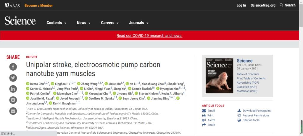 1月29日,我校智能柔性机械电子研究院丁建宁教授团队与美国德克萨斯州立大学达拉斯分校雷伊·鲍曼院士课题组等国际团队合作,在新一期国际顶级学术期刊《科学》(Science)杂志上刊文“Unipolar stroke, electroosmotic pump carbon nanotube yarn muscles”,提出了一种新型高性能电化学驱动人工肌肉,探索出了人工肌肉全新的驱动机理,大大推动了纤维人工肌肉的应用。