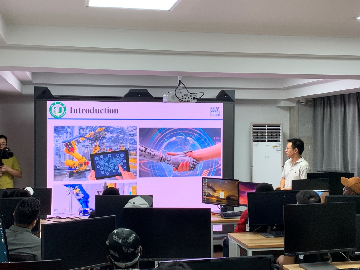 近日,机械学院在人工智能与智能制造学院实验室举办“体验智能制造”中外学生交流活动。智能制造系教师、来华留学生代表、部分本科生参加了本次活动。本次活动共分为三个部分:专题报告、机器人培训、实操训练。