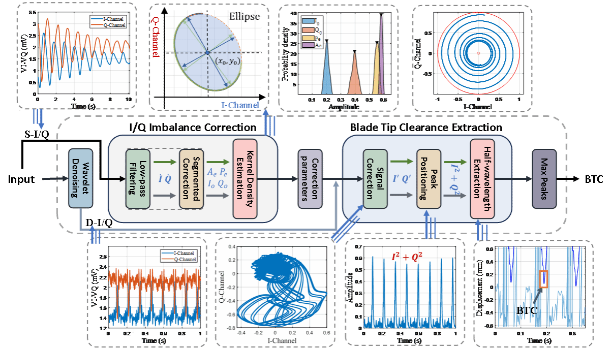 叶片作为航空发动机的做功的核心部件,叶片端面与机匣内壁之间的叶尖间隙参数是影响发动机工作效率及运行安全的关键。其间隙参数的变化直接影响发动机效率、推力和发动机系统的整体使用寿命。在现有的叶尖间隙的测量方案中,微波传感器因其带宽更宽、传感器尺寸紧凑和较强的抗污染能力成为间隙测量的可行方案。然而,在近距离微波测量中,回波信号呈现出严重幅值调制现象,造成传统正交校正方法失效,显著影响了相位差测距方法的精度。另一方面,依据相位差测距法原理,相位信息被折叠,这将导致叶尖间隙区域受非叶端部分干扰以至于难以有效提取间隙区域。