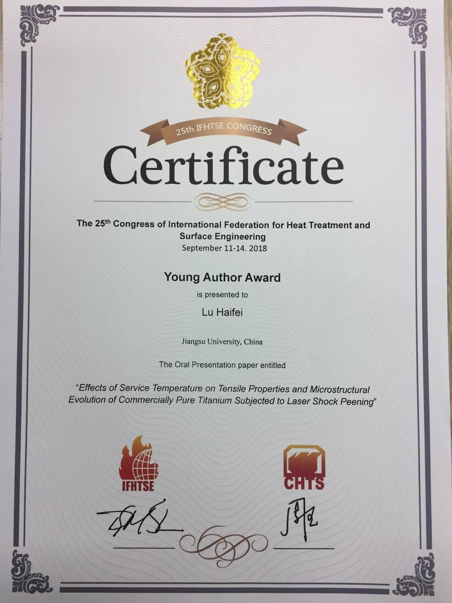 此外,我院卢海飞同学在参会期间参加了优秀论文评比,并以论文“Effect of service temperature on tensile properties and microstructural evolution of commercially pure titanium subjected to laser shock peening”获得了优秀青年作者奖。
