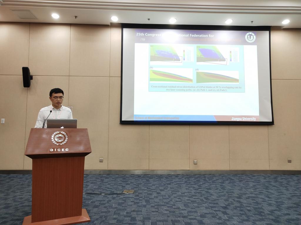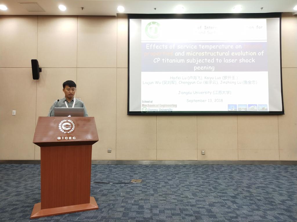 会议期间,我院卢海飞同学做了题为“Effect of service temperature on tensile properties and microstructural evolution of commercially pure titanium subjected to laser shock peening”的分会场交流报告,我院徐刚同学做了题为“FEM investigation of scanning path and overlapping rate on residual stress of 316L stainless steel blade subjected to laser shock peening”的分会场交流报告。主要介绍了激光冲击强化技术的特点及工作原理以及激光冲击强化技术对材料表面的改性方面的工作,报告得到了在座的学者的广泛关注和好评。