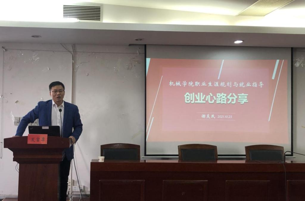 10月23日,机械学院在七楼报告厅开展“创业心路分享”大学生职业生涯教育与就业指导讲座。讲座邀请杰出校友、天津金米特科技股份有限公司董事长谢炎民主讲,学院一百余名学生参加。讲座由学院党委副书记张黎明主持。