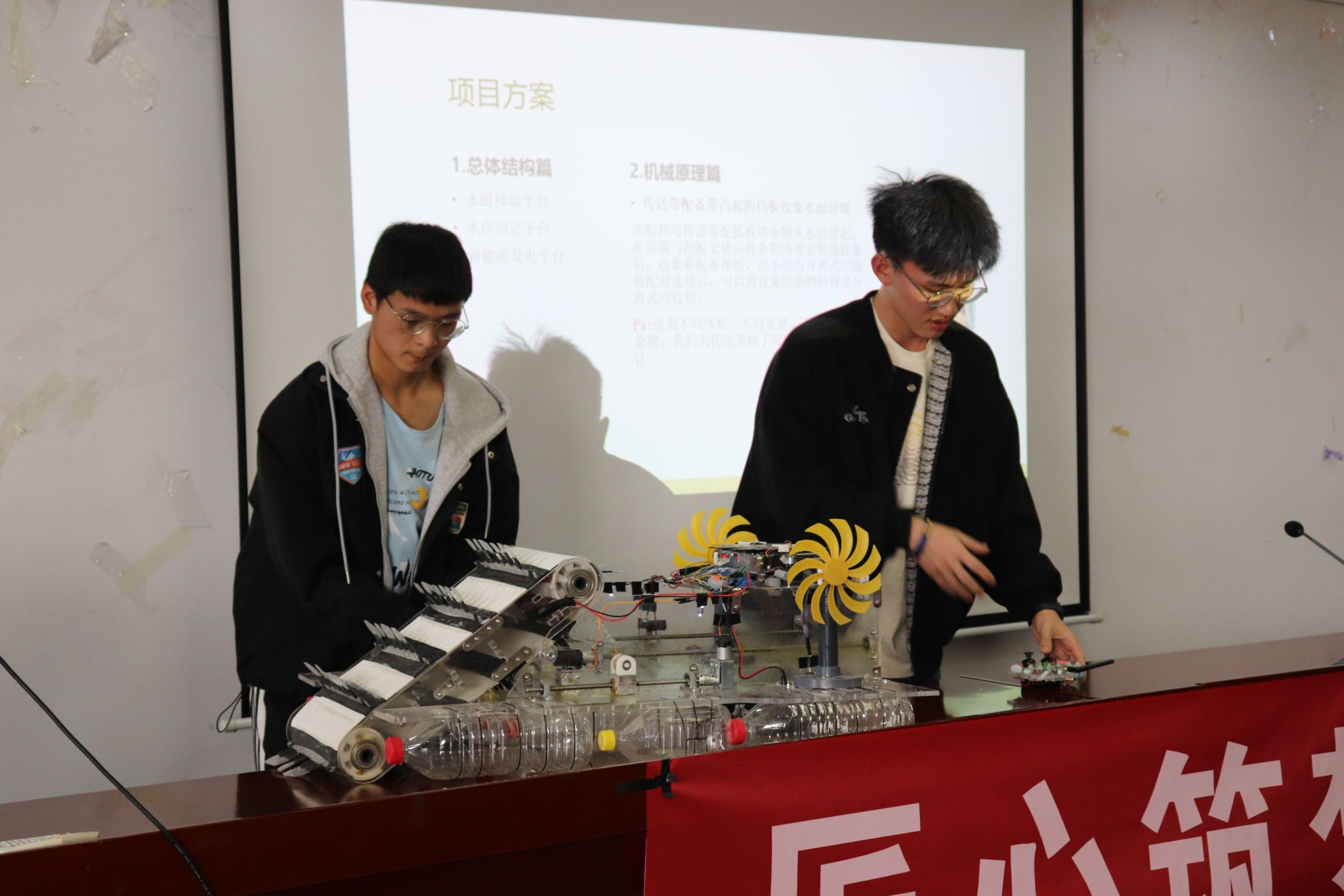 此次比赛共收集到“斥灰星”一种节能式高空清洁管家、新能源水面杂物清理平台、漫步“广寒宫”、投石循迹小车、重力小灯等22组团队报名,比赛中,同学们积极思考发挥自身创新思维和动手能力,向评委们介绍自己的产品及设计理念,得到了评委的一致肯定。