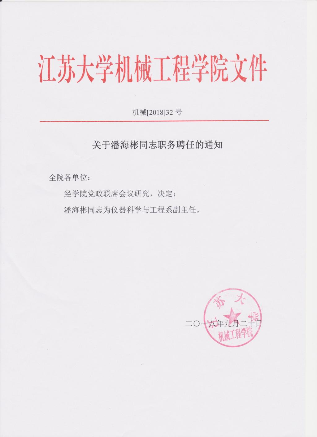 关于潘海彬同志职务聘任的通知