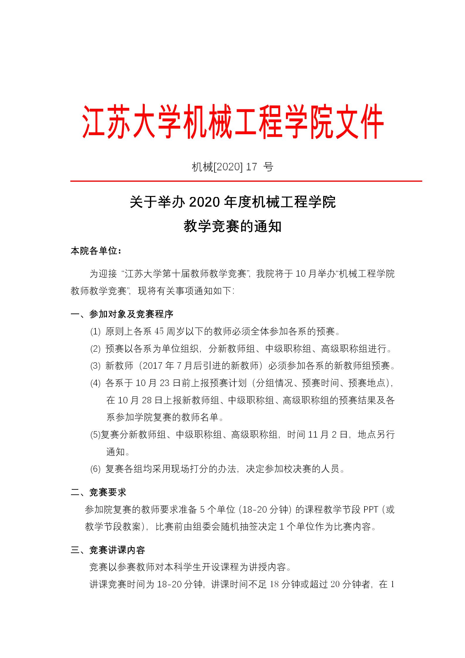 关于举办2020年度1946伟德国际源自英国教学竞赛的通知(机械[2020] 17 号)