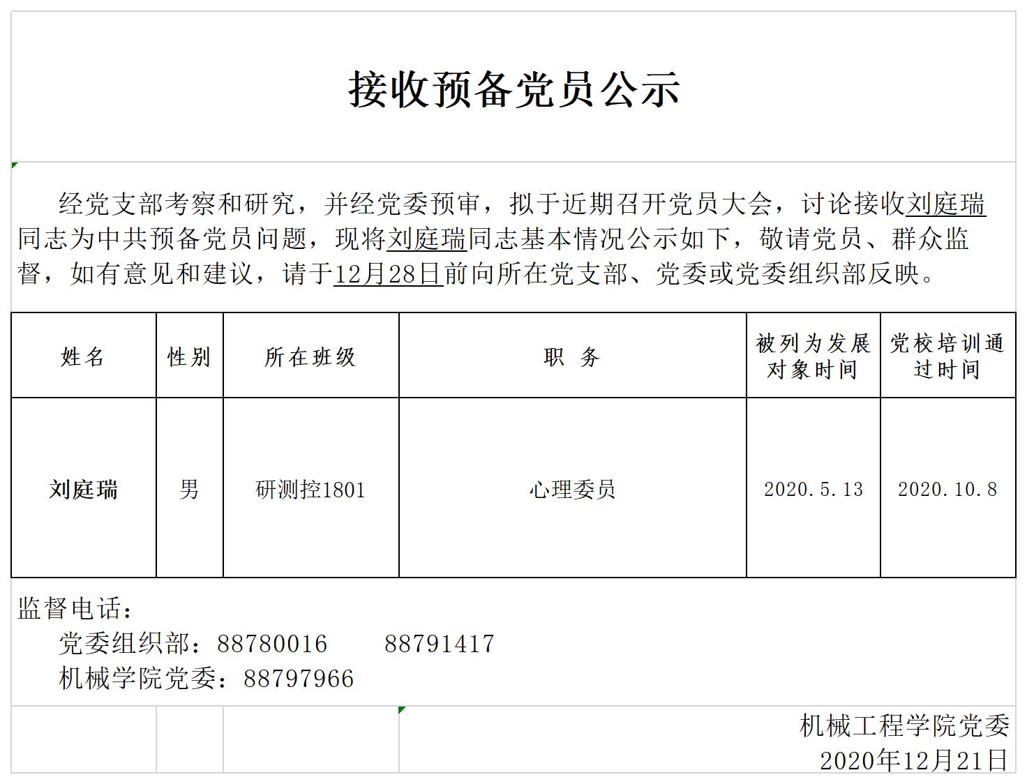 机械学院2020年下半年接收预备党员公示2020年12月21日
