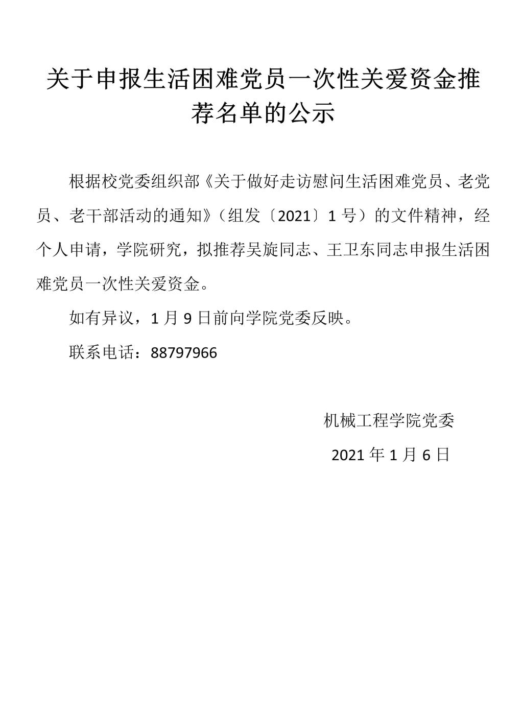 关于申报生活困难党员一次性关爱资金推荐名单的公示