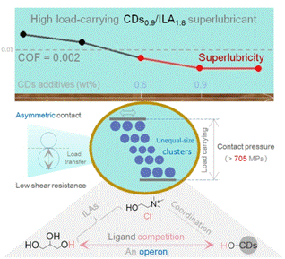 液体超润滑材料在人工关节、机械加工等领域具有广泛的应用前景。伟德国际victor1946梁红玉副研究员团队从添加剂群体间相互作用的角度,提出以碳点(CDs)作为竞争配体操纵子,开发了一种兼具超高承载和超润滑的碳点/类离子液体(即CDs/ILAs)超润滑材料(如下图),即:通过向ILAs中加入微量CDs,扩展物种团簇的尺寸分布,实现了在陶瓷摩擦副界面的高承载(>705MPa, 报道的最高值)宏观超润滑。CDs表面的含氧官能团与原始H键供体之间的竞争有效地增加了非等尺寸团簇之间的非对称接触概率,从而降低了界面剪切阻力、实现了以流体动压机理主导的液体超润滑;其中,CDs兼具减摩和提升载荷功能。该研究为设计高性能的ILAs-基液体超润滑材料提供了新视角。