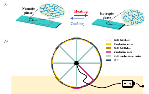 智能材料变形驱动是集材料、力学、生物学等多学科的交叉前沿研究热点。液晶弹性体(Liquid crystal elastomers,LCEs) 作为能够产生大的可逆驱动应变的智能柔性弹性体材料,通过设计含有各向异性刚性介晶单元的聚合物网络结构,在外界刺激下(光、热、电等) 使其达到相转变温度时,引发由液晶态(有序)向各向同性态(无序)转变的链段运动,进而表现为宏观结构程序化变形。液晶弹性体材料类似于自然界生物体在多种外界刺激下自我调节的特性,在开发智能仿生设备和构建软体机器人系统中拥有巨大的应用前景。