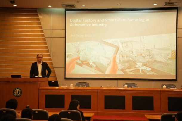 李书涛教授介绍了汽车的发展历程以及各阶段的里程碑,并通过应用案例对数字化制造在汽车工业应用做了详细的介绍。随着科技的飞速发展,汽车行业正积极拥抱工业4.0及数字化转型,通过一系列先进技术的应用,实现高效、智能和个性化的生产。李书涛教授对数字化工厂、制造信息系统、自动控制与自动化技术、数字孪生及虚拟调试技术、物联网和大数据分析等技术做了介绍,使与会师生了解到更加高效、智能和个性化的生产模式会为汽车行业带来前所未有的变革。