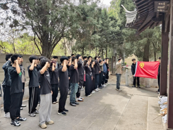 To cultivate the patriotism of young students, strengthen the ideals and beliefs of youth in the new era, and further inherit the legacy of revolutionary ancestors, the School of Mechanical Engineering held a Qingming Festival martyr commemoration activity themed "Commemorating Revolutionary Martyrs, Pursuing Red Memories" at "Wang Long Pavilion" — the patriotic education base of Jiangsu University on April 9. Ling Zhiyong (teacher from the Care Committee for the Growth of Young People (CCPE) of the School of Mechanical Engineering), all Party branch secretaries, representative of academy counselors, representative of student Party members, and representative of active Party members participated in the activity.