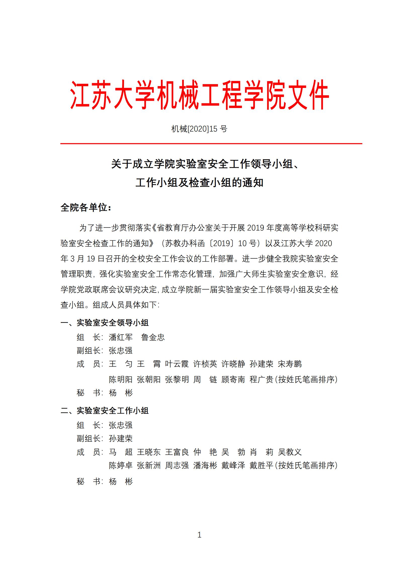 机械[2020]15号 关于成立学院实验室安全工作领导小组、工作小组及检查小组的通知