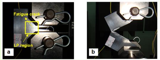 Crack block and fatigue strip in fatigue fracture under differentlaser peening coverage areas