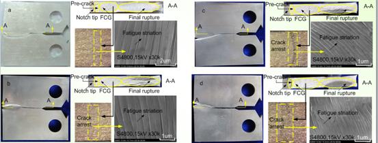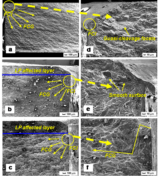 Morphologies of the fatigue crack initiation region onthe notched samplessubjected tomultiple laser peening impacts