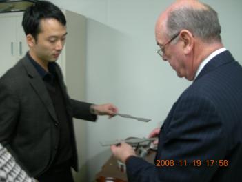 任旭东博士(左一)向Peter O'Hara 教授(右一)介绍激光冲击抗疲劳技术